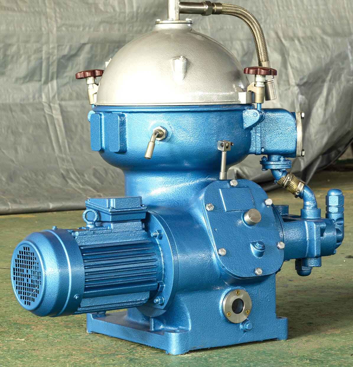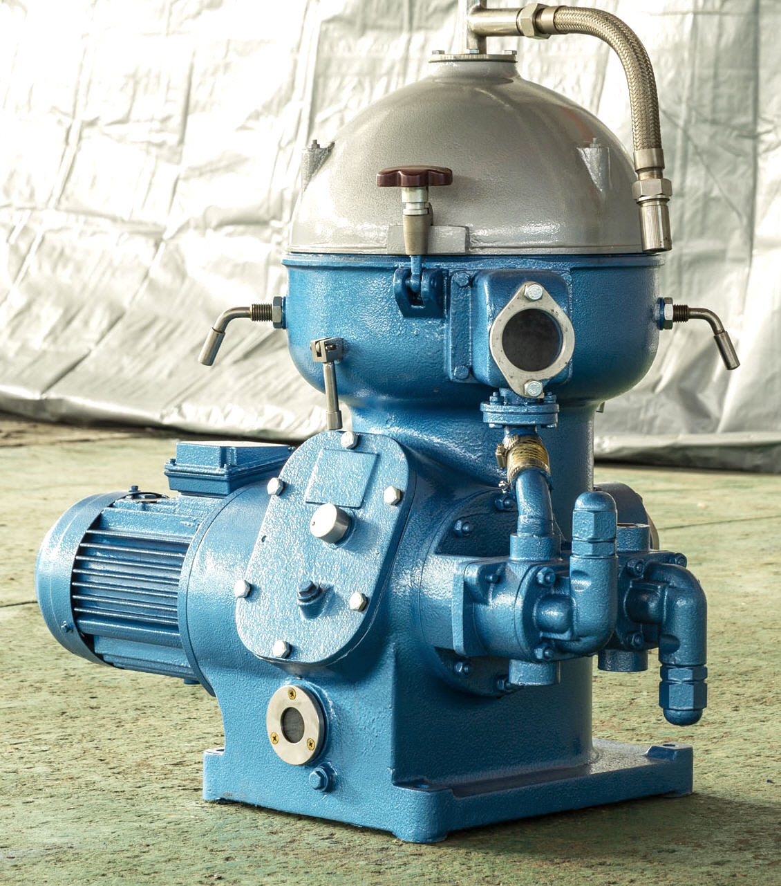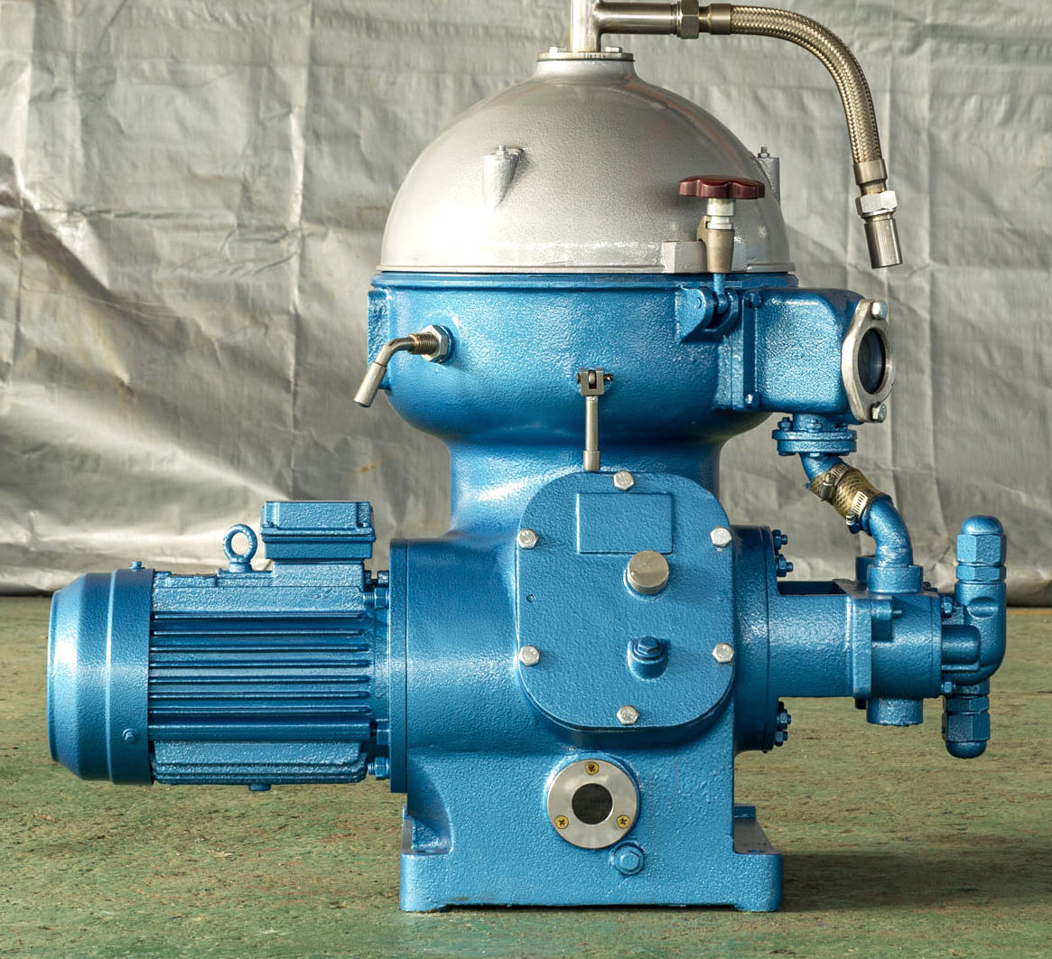 a liquid trap and an inlet bearing block. A flexible principal axis is located at the upper part of the bowl and a damping floating bearing